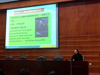 讲座中,马教授介绍了发热的定义和发病机制,详细阐述了不明原因发热的诊治思路,应该从确定发热、询问病史、体温检查、辅助检查、鉴别诊断线索五个方面进行探索研究。马教授还结合两个典型临床病例,运用了大量图片和检测数据进行讲解,从点到面,面面俱到,使抽象深奥的专业知识变得形象直观、通俗易懂。马教授还希望同学们通过日积月累的学习和临床实践,树立正确的价值观,塑造良好的医德医风,努力成为一名优秀的医务工作者。马教授的精彩讲座不时博得同学们阵阵热烈的掌声,大家听得聚精会神,并认真做好笔记。