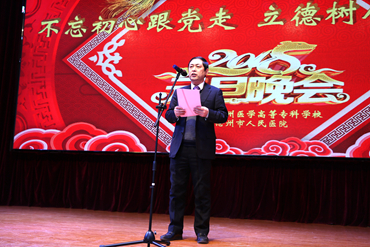 2017年12月31日晚,我校第一学术报告厅灯光璀璨,欢歌笑语,充满了节日的喜庆气氛。我校“不忘初心跟党走,立德树人谱新篇”2018年元旦晚会正在这里隆重举行。学校领导班子成员、沧州市人民医院领导嘉宾、学校副科级以上干部与300余名师生代表共同观看了晚会。
