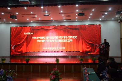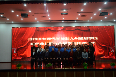 在会议厅,学校一行参加了公司为我校学员举行的现代学徒制拜师典礼,我校全体实习生参加了拜师典礼。典礼上,我校5名学员代表正式拜师公司导师;随后,陈志军总经理和刘健书记又分别代表双方单位进行了沧州医专九州通学院的揭牌;最后,双方领导分别致辞,并与全体实习生合影留念。