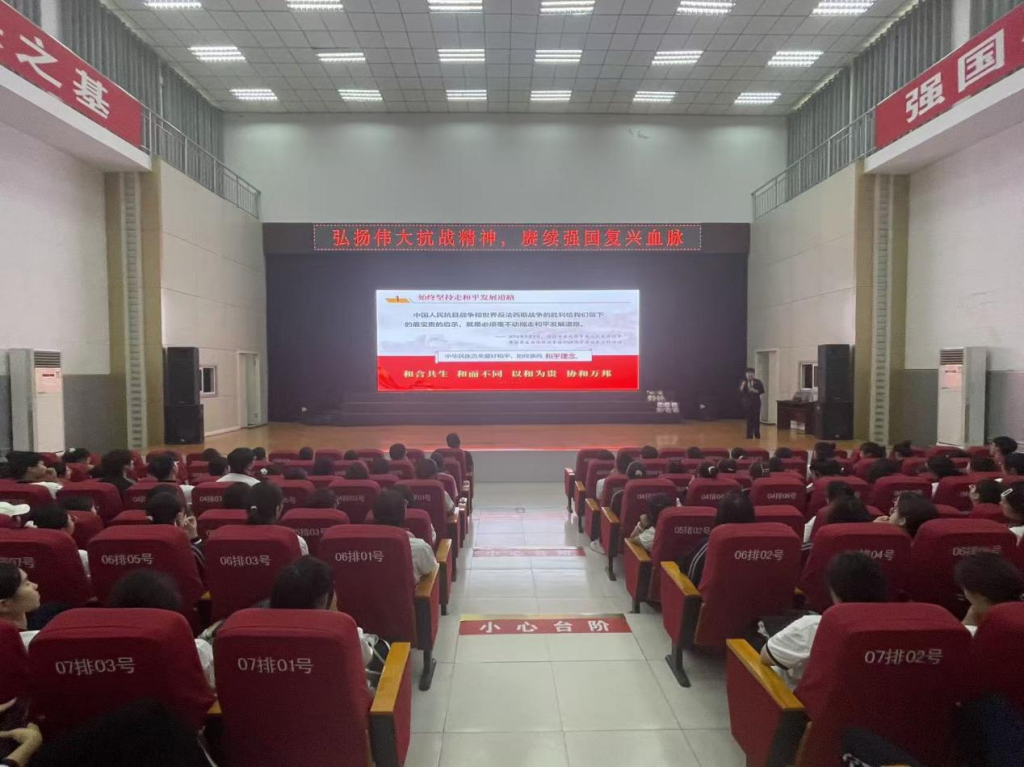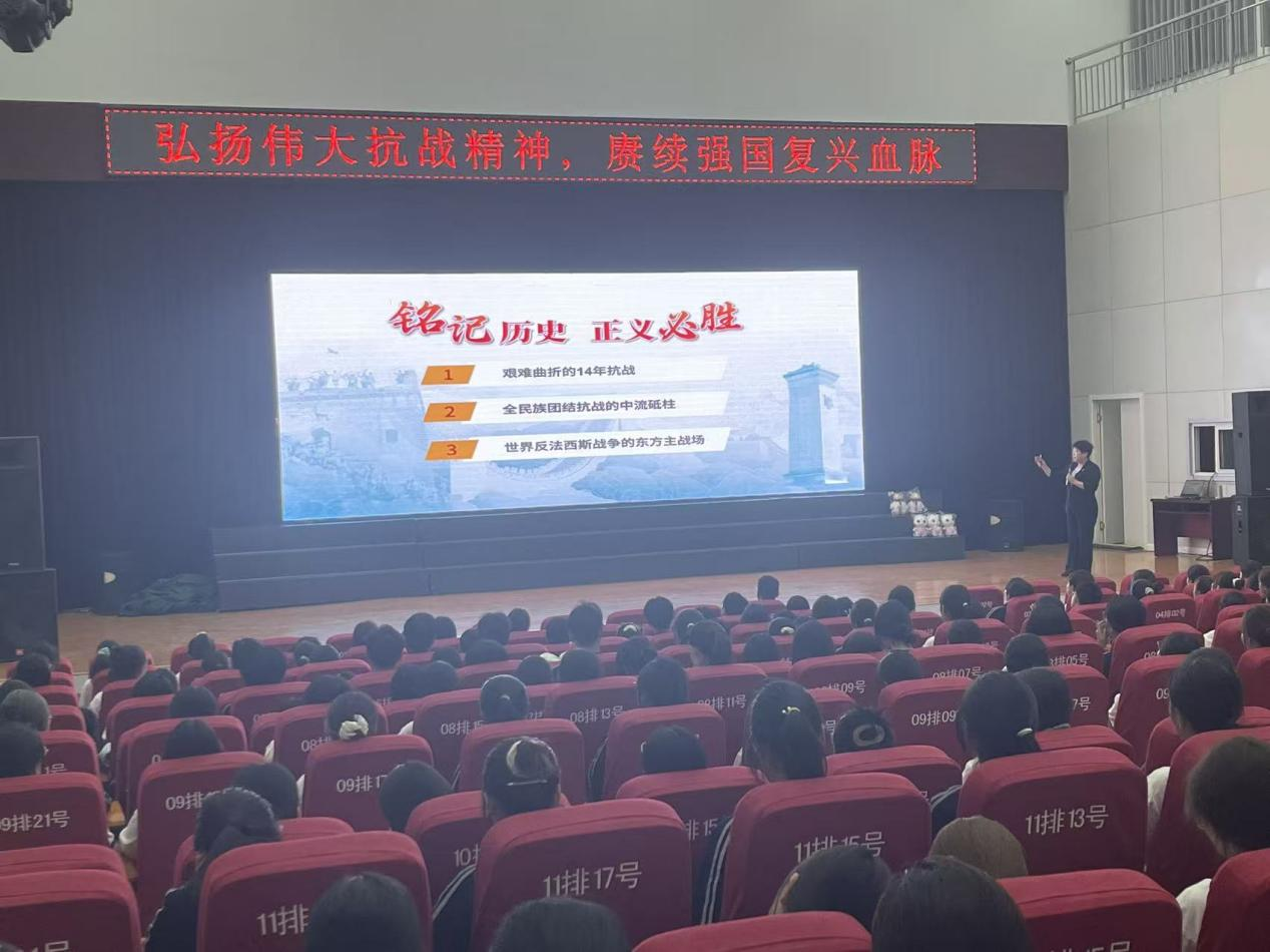 “习近平总书记在纪念中国人民抗日战争暨世界反法西斯战争胜利80周年大会上的重要讲话,饱含着铭记历史、缅怀先烈的深厚情怀,彰显了珍爱和平、开创未来的使命担当。伟大抗战精神作为中华民族弥足珍贵的精神财富,始终引领着一代代中国青年勇挑重担、拼搏奋进。在新的时代背景下,传承和弘扬抗战精神,对于青年学子成长成才、实现中华民族伟大复兴具有不可估量的价值。”才晓茹从“铭记历史,回溯抗战艰苦历程”“感悟力量,弘扬伟大抗战精神”“珍爱和平,开创民族复兴未来”三个维度,抽丝剥茧、层层递进,为学生们深入解读抗战历史与伟大抗战精神的丰富内涵。“抗日战争是一场唤醒民族意识、凝聚民族力量的伟大战争,是改变国家命运的关键之战。中国共产党自始至终都是反抗日本军国主义侵略的先锋,最早宣传、动员、组织和抗击侵略者;积极倡导、组织、巩固和维护抗日民族统一战线,成为全民族团结抗战的坚强政治领导核心;提出并践行正确的战略战术,为抗战胜利指明方向。中国共产党领导的人民抗日武装,更是在夺取抗战胜利的过程中发挥了决定性作用”。
