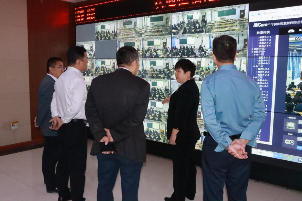 在现代教育技术中心,大屏上实时切换着多个课堂画面,校领导细致查看学生出勤、教师授课与互动情况,精准把握教学实况。