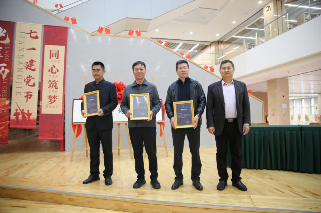 李炳仁为捐赠艺术作品的韩冬、张泽良、石磊三位老师颁发捐赠证书。这些作品将被永久珍藏,持续滋养师生的人文情怀与审美情趣。