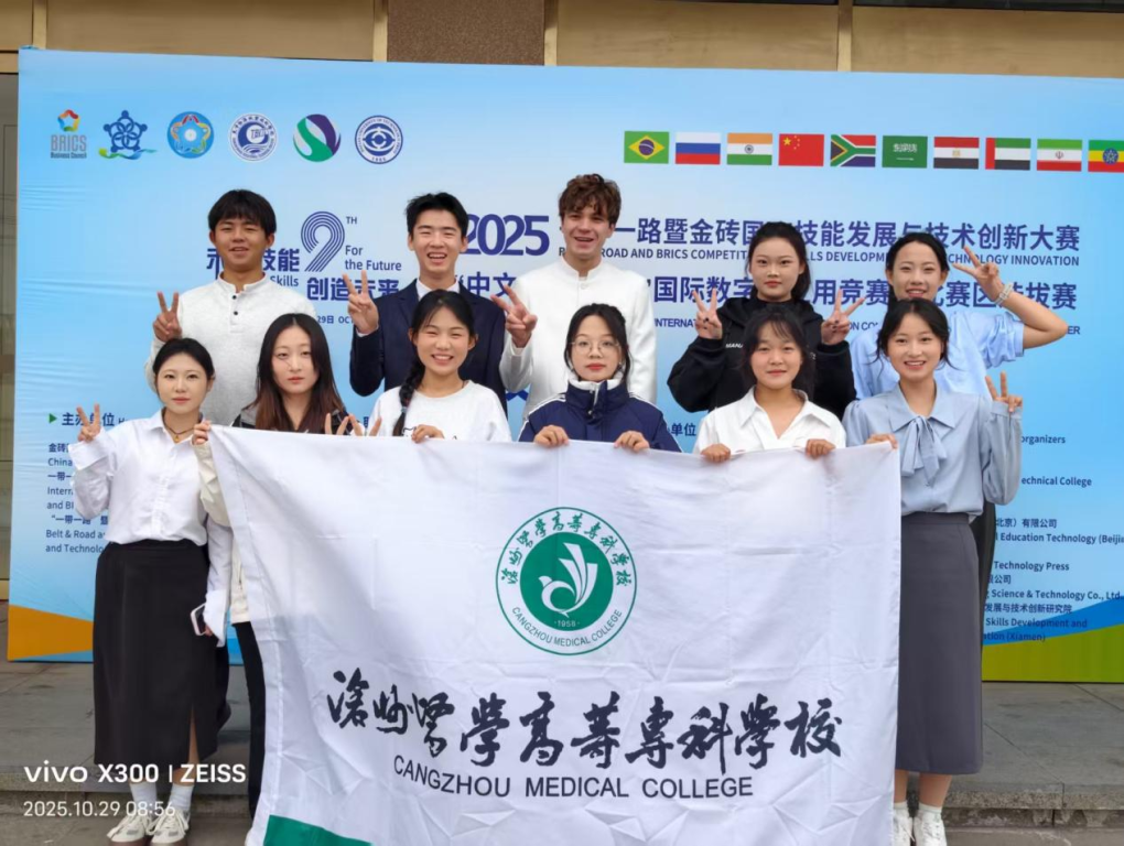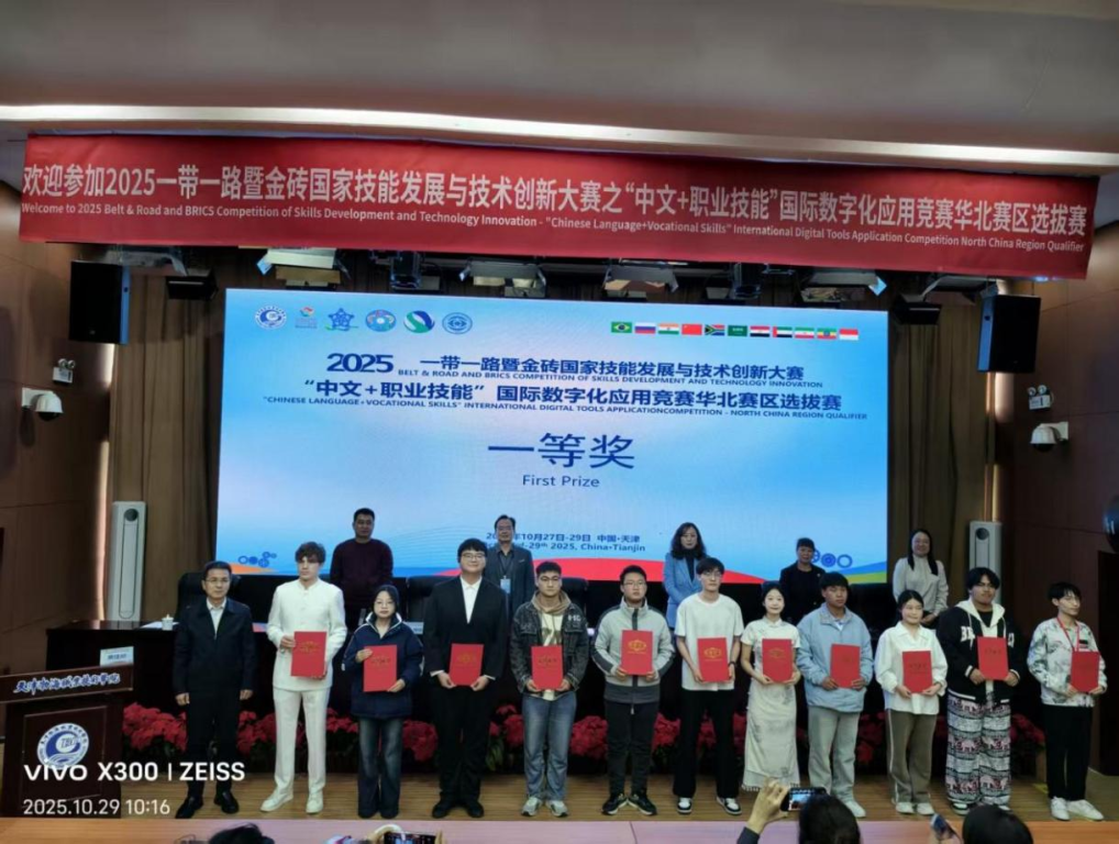 10 月 27 日至 29 日,2025 “一带一路” 暨金砖国家技能发展与技术创新大赛 “中文+职业技能” 国际数字化应用竞赛华北赛区选拔赛在天津渤海职业技术学院圆满落幕。我校参赛队伍表现亮眼,11支队伍从近百支复赛队伍中脱颖而出、全员获奖。