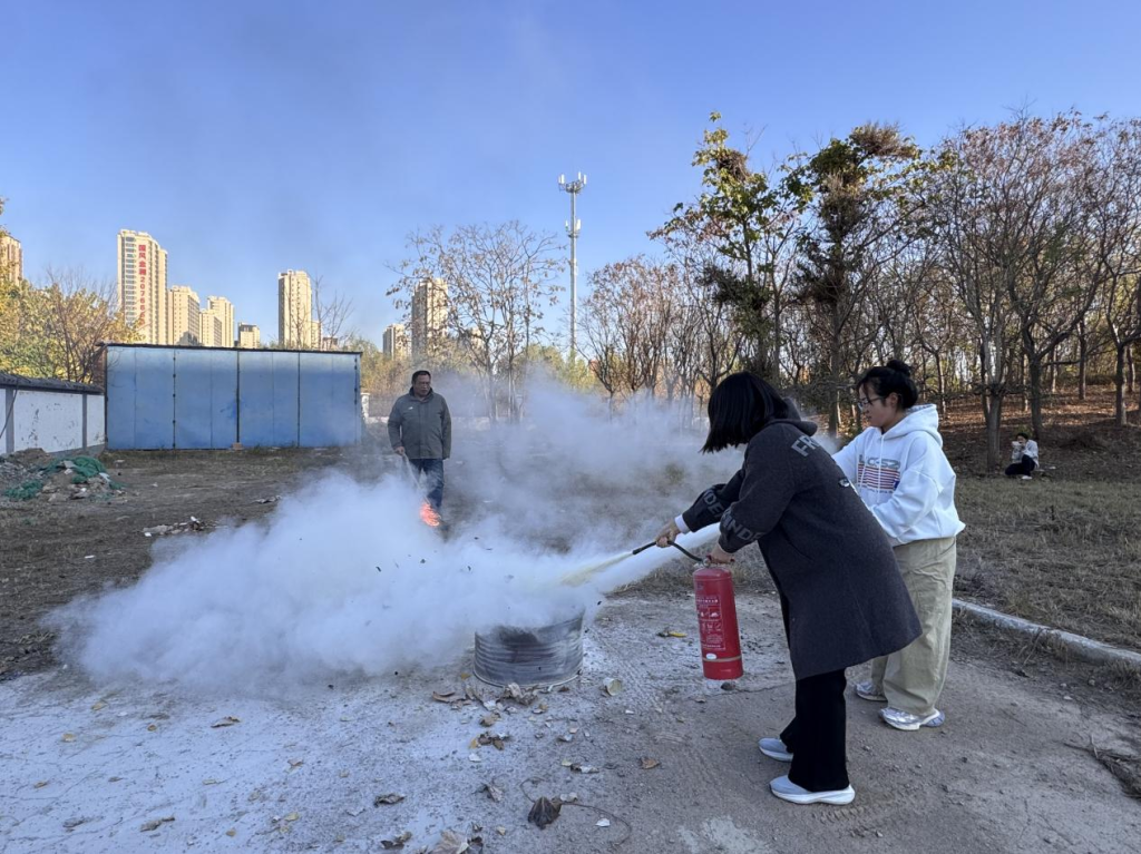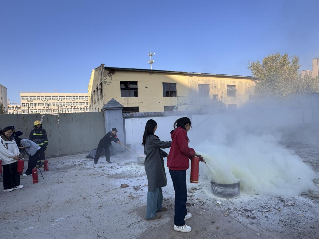 演练结束后,消防专家还指导师生们开展灭火器实操培训。50余名师生及宿管人员轮番上阵,掌握“提、拔、握、压”四步操作法,提升扑救初起火灾的能力。