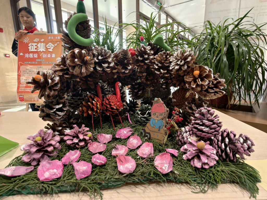 “松”生妙手松子手工艺品展则藏着另一种惊喜。松果的厚重、松子的精巧,在同学们手中幻化成一件件有温度的作品:松针编织的工艺品纹路细密,松果堆叠的小摆件造型别致,松子串成的挂饰精巧可爱......每一件都透着对自然材料的敬畏与巧思。这些作品没有华丽装饰,却凝聚着创作者反复打磨的耐心,正如“大爱沧医”的育人理念,于细微处见真情,于坚守中显匠心。