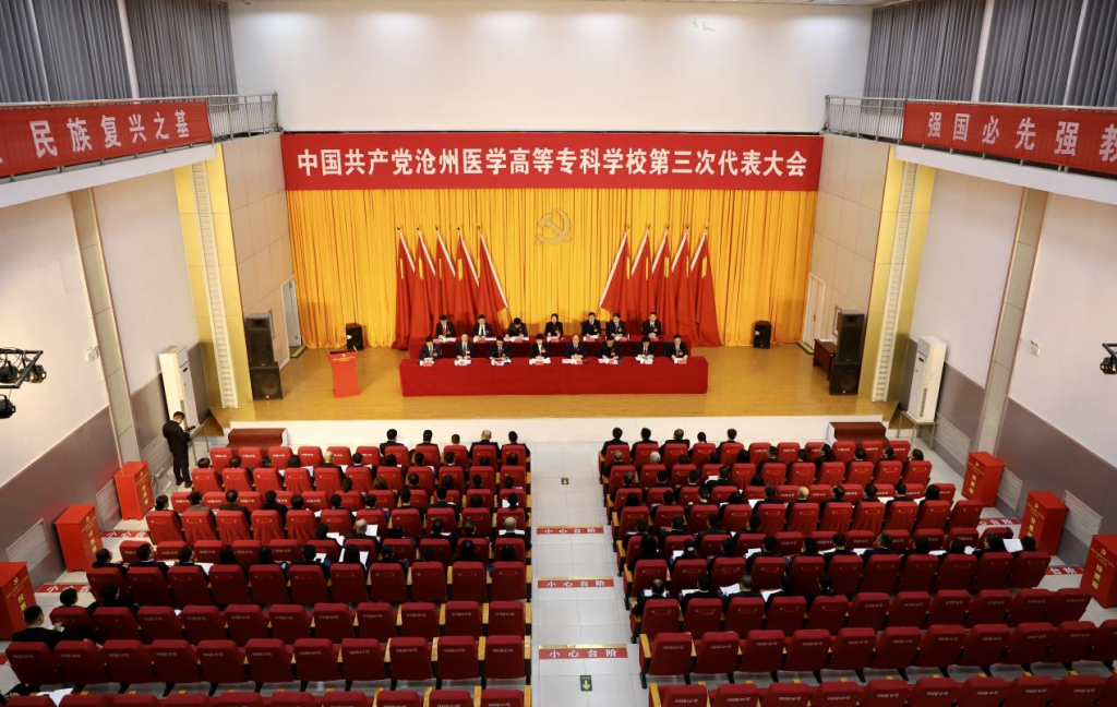 中共沧州市委组织部副部长杨文通、中共沧州市委教育工委副书记代砚广出席大会并讲话。学校党委书记才晓茹代表中国共产党沧州医学高等专科学校第二届委员会向大会作报告。学校党委副书记、校长王衍主持会议。
