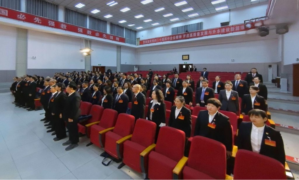学校东报告厅内气氛庄严热烈。镰刀锤头组成的中国共产党党徽悬挂在主席台正中,熠熠生辉;十面鲜艳的红旗分列两侧,交相辉映。“贯彻落实党的二十届四中全会精神,开启高质量发展与升本建设新篇章”的条幅悬挂在二楼眺台上。