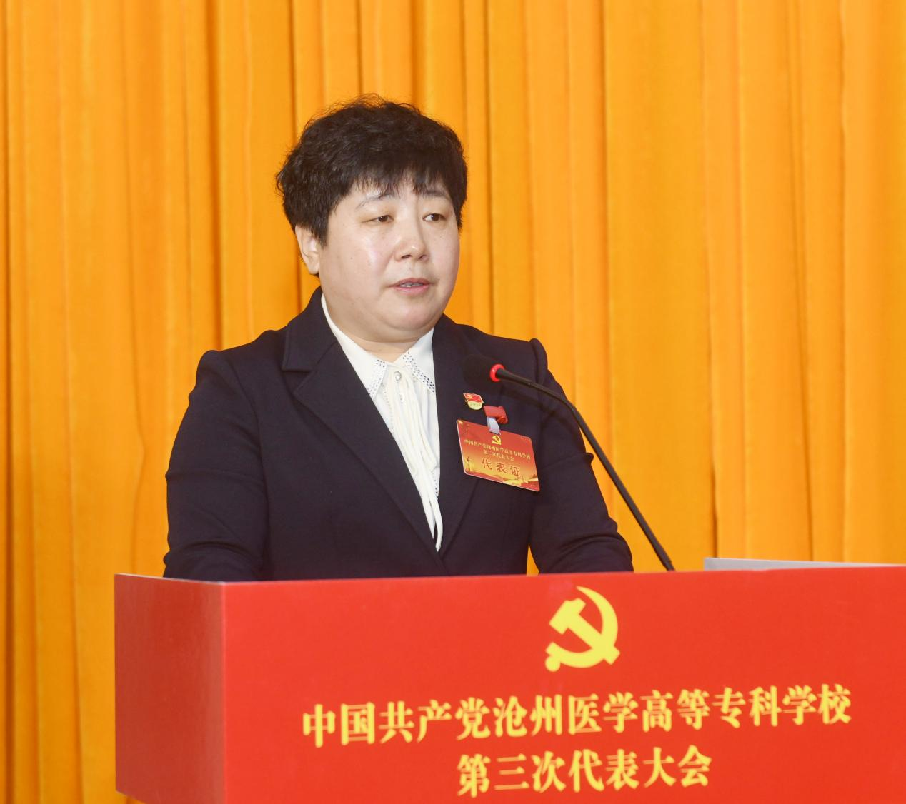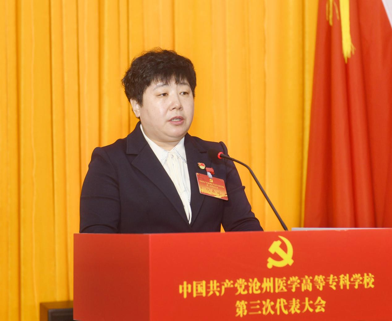 才晓茹代表中国共产党沧州医学高等专科学校第二届委员会向大会作了题为《高举旗帜开启新征程,勇担使命奋进创业路,为全面建成特色鲜明医学本科院校而团结奋斗》的报告。