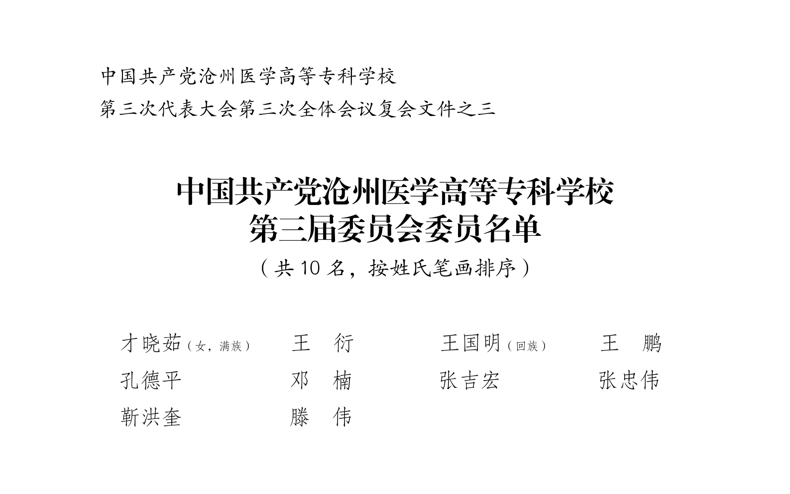 才晓茹当选中国共产党沧州医学高等专科学校第三届委员会书记;王衍、靳洪奎当选中国共产党沧州医学高等专科学校第三届委员会副书记。