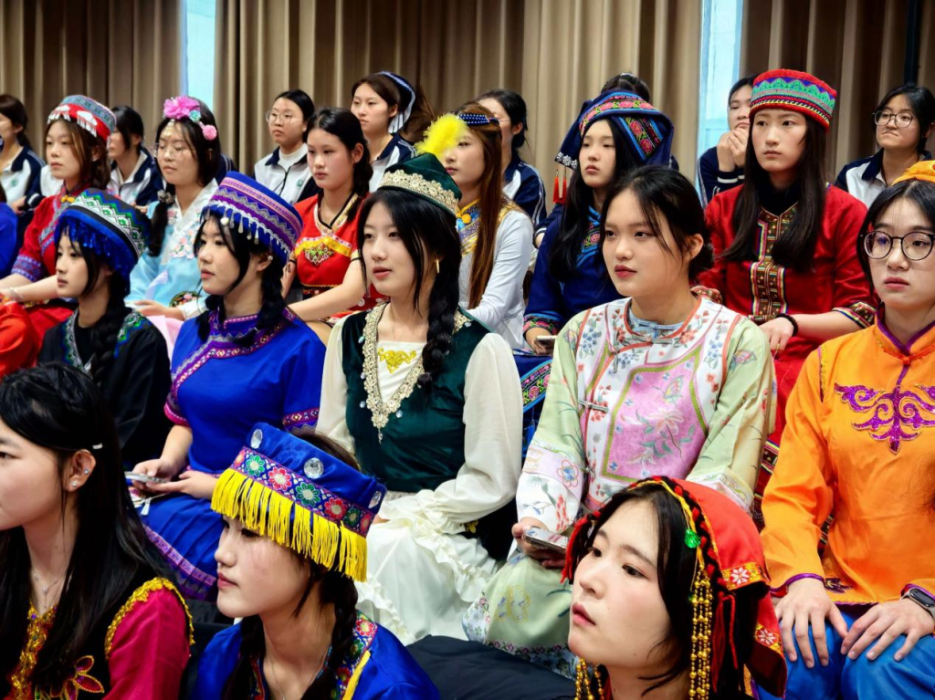 课堂的高潮,在身着 56 个民族传统服饰的同学们的惊艳亮相中到来。5位民族服饰代表同学率先登台,以趣味竞猜点燃全场热情;随后,51位身着不同民族服装的同学依次走上台前,以清脆的声音诉说民族身份,以绚丽的服饰展现独特的民族风情。蒙古族的豪迈奔放、苗族的灵动秀美、维吾尔族的绚丽多姿、藏族的庄重典雅......一幅幅多彩的民族文化画卷在课堂徐徐展开,让同学们近距离感受各民族文化的独特魅力,深刻体悟“56个民族56朵花,56族兄弟姐妹是一家”的温暖内涵,更让“石榴籽紧紧抱在一起”的理念深植于心。
