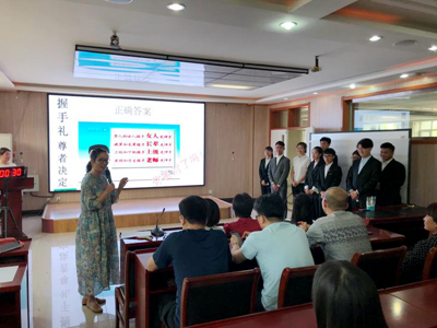 经过预赛,共有9名同学闯入决赛。决赛于5月31日在医护实训中心108室举行。招生就业指导中心主任马小允,创新创业指导中心主任齐晓翠,招生就业指导中心李晓文老师、杨玲老师、徐梅老师担任评委;各系部领导观摩了比赛。比赛开始后,选手依次进行自我介绍,回答了老师们提出的问题。今年的比赛增加了无领导小组讨论面试,通过讨论选出一个医学相关的成语,参赛者分两组进行简笔绘画,小组成员轮换上场,一人30秒画出指定场景。最后由评委老师投票,票数多者获胜;获胜小组每位成员可获得加分奖励。这一环节的比拼考察了同学们的临场应变能力以及团队协作能力。随后的现场观众抢答环节更是将现场的气氛推向高潮。徐梅老师还现场为同学们讲解了面试礼仪知识,同学们表示受益匪浅。