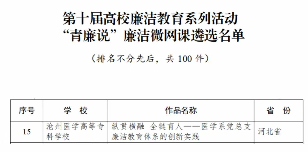 医学技术系党总支选送的视频类《树廉洁之风,守纯净之心》、医学系党总支选送的微课类《白衣青春,廉洁同行》、学校党委、学校纪委共同撰写的实践案例《“四廉诊脉、四看询证”纪检“爱廉坊治未病”廉洁教育创新实践》三个作品入选河北省教育厅遴选名单。